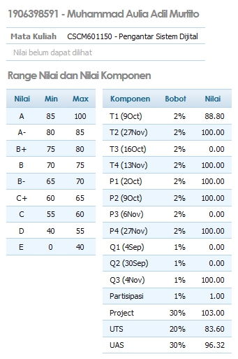 This course contained 3 credits which took 150 minutes for 2 classes. Back then, my Tuesday and Thursday morning were used for this course. If I count it right, you will have 6 absence quotas (3 months x 4 weeks x 2 days x 25%). The scoring system was like this.